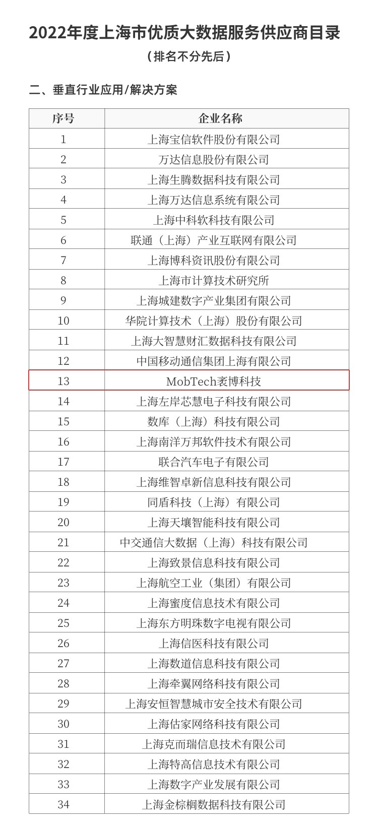 近日,上海市經(jīng)濟(jì)和信息化委員會發(fā)布了“2022年度上海市優(yōu)質(zhì)大數(shù)據(jù)服務(wù)供應(yīng)商目錄”,MobTech袤博科技與移動、聯(lián)通、萬達(dá)信息、第 一財經(jīng)等知名企業(yè)共同入選。這也是繼2020年入選后,企業(yè)再度入圍該目錄。