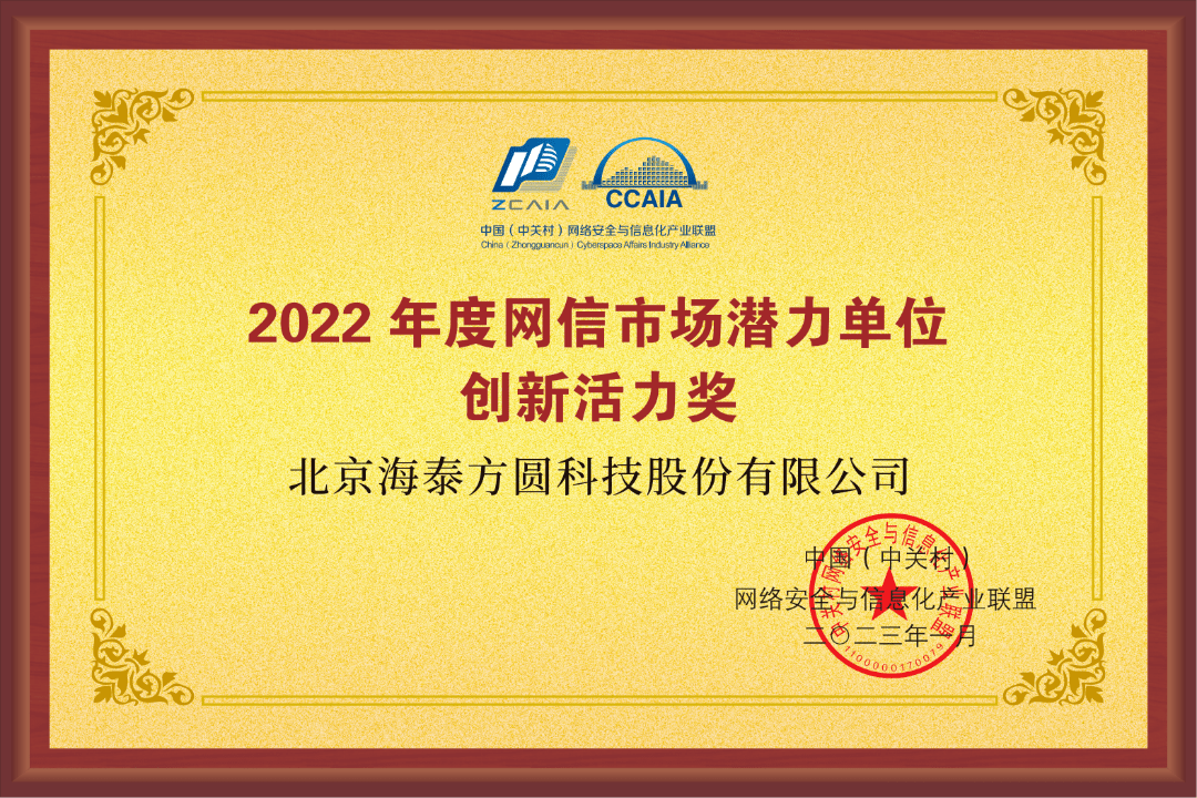 2023年2月11日下午,中關(guān)村網(wǎng)絡(luò)安全與信息化產(chǎn)業(yè)聯(lián)盟(以下簡稱“聯(lián)盟”)線上召開聯(lián)盟第二屆第五次會員大會。會上,聯(lián)盟為特別突出貢獻的會員企業(yè)給予了獎勵和肯定。海泰方圓斬獲“《中國網(wǎng)信產(chǎn)業(yè)橘皮書—數(shù)據(jù)安全》突出貢獻單位”“2022年度網(wǎng)信市場潛力單位創(chuàng)新活力獎”“2022年度聯(lián)盟工作特別支撐單位”三項榮耀,榮譽的獲得將激勵海泰方圓在2023年輸出更出色的工作成果,為聯(lián)盟的高質(zhì)量發(fā)展貢獻力量。