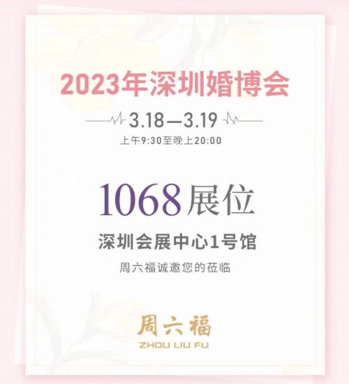 2023年深圳婚博會,周六福珠寶誠邀您的蒞臨,在3.18-3.19上午9:30至晚上20:00于深圳會展中心1號館1068展位舉行。