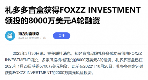 近日,據美聯社消息,中國盲盒品牌禮多多成功完成A輪融資,獲得由FOXZZ INVESTMENT領投、多家風投機構跟投的8000萬美元投資。此前,禮多多已獲得兩輪共計7700百萬美元的戰(zhàn)略融資。