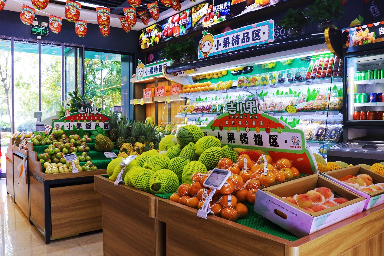 走進(jìn)吉小果門店,能發(fā)現(xiàn)品牌logo靚麗獨(dú)特,門頭設(shè)計(jì)討喜,店內(nèi)設(shè)計(jì)簡(jiǎn)約時(shí)尚。再看商品陳列,品類多、品種豐富,區(qū)域劃分合理,不同類型的消費(fèi)者都能快速鎖定產(chǎn)品,完成購物。