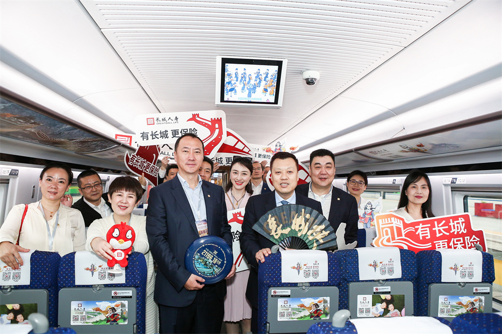 剪彩儀式結(jié)束后,長城人壽領(lǐng) 導(dǎo)及嘉賓登上冠名專列,觀摩高鐵車廂內(nèi)外媒體展示情況。車廂外,長城人壽logo醒目的顯現(xiàn)在高鐵車身上,“有長城,更保險(xiǎn)”的口號也格外吸引大家的目光。車廂內(nèi),來自長城人壽的品牌元素格外顯眼,“長城俠”IP形象、主視覺形象海報(bào)等,出現(xiàn)在車廂醒目位置,“長城人壽”報(bào)站音也不時(shí)從列車廣播中傳來。多媒體展現(xiàn)形式,多彩生動的主題畫面,全方位、沉浸式的場景設(shè)計(jì),形成超強(qiáng)的視覺沖擊力,讓乘客切身感受到長城人壽品牌的力量。