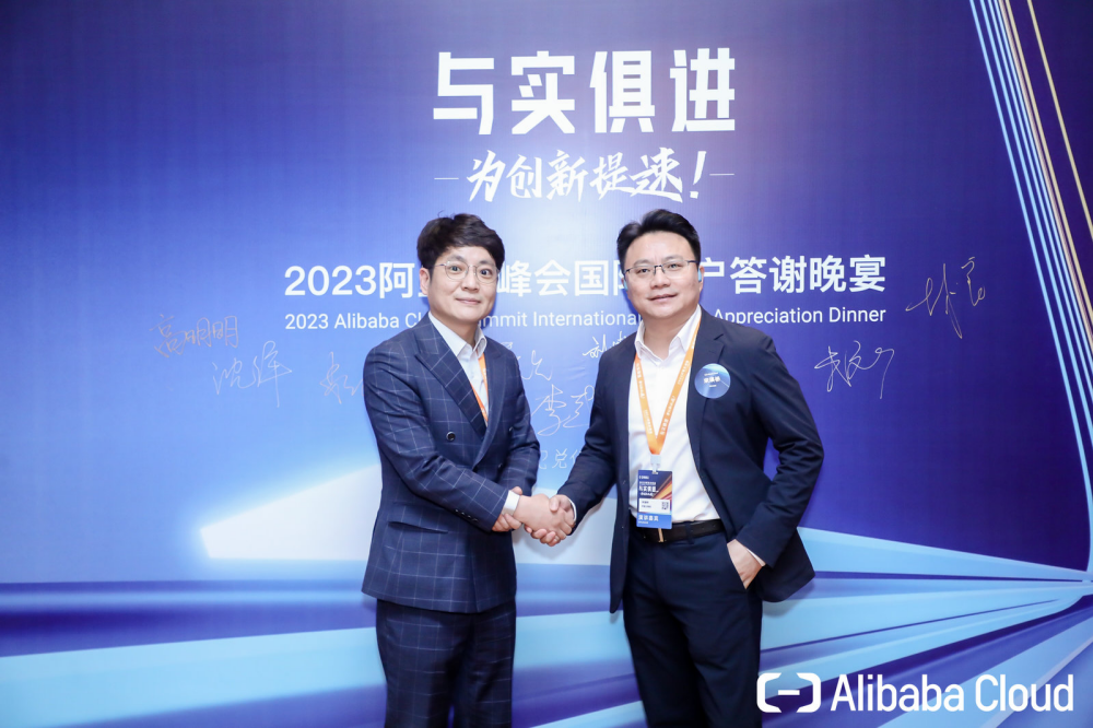 艾多美(中國)信息部負責(zé)人沈兌俊(左) 和 阿里云智能國際事業(yè)部副總裁宋瑛橋(右)