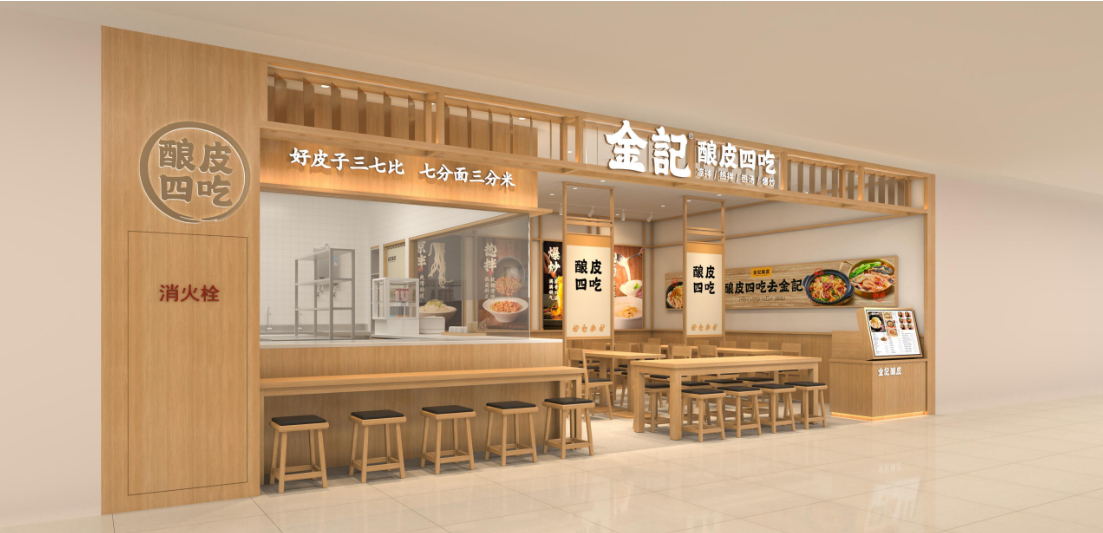 與傳統(tǒng)釀皮店裝修不同,金記釀皮采用原木色調(diào)的簡約幾何空間設(shè)計(jì),彰顯食物暖意,明檔廚房,全透明操作,帶給顧客最直觀的互動感,更符合現(xiàn)在主力消費(fèi)群體的風(fēng)格偏好。門店配備專屬定制釀皮設(shè)備,1㎡可滿足萬元店。制作流程的標(biāo)準(zhǔn)化,出餐流程的規(guī)范化,讓門店操作環(huán)節(jié)更簡潔,大大減輕了門店對廚師的依賴性。無論是涼拌,熱拌,爆炒,還是熱湯,出餐速度可以在5分鐘內(nèi)完成,還能做到鍋氣十足,讓更多人吃快餐,想釀皮,吃釀皮,到金記。