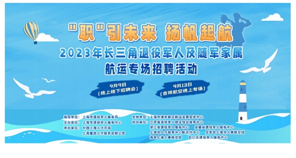 為推動退役軍人及隨軍家屬高質(zhì)量穩(wěn)定就業(yè),進一步滿足上海國際航運中心建設(shè)的人才需求,“‘職’引未來 揚帆啟航”2023年長三角退役軍人及隨軍家屬航運專場招聘將于9月1日正式開啟!本次活動由上海市退役軍人服務(wù)中心聯(lián)合江蘇、浙江、安徽三省退役軍人事務(wù)部門及部隊相關(guān)單位共同舉辦。專場招聘系列活動即將精彩來襲,正在找工作的退役軍人及隨軍家屬一定不要錯過。