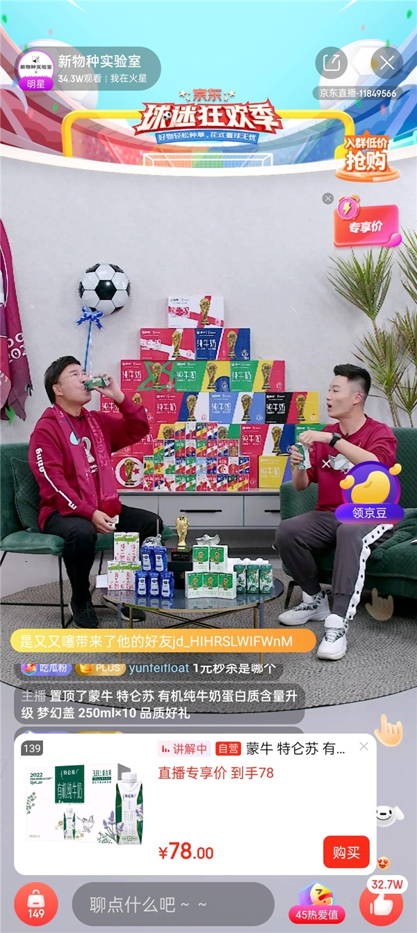 以京東平臺的【京英直播答題賽】為例,直播現(xiàn)場利用內(nèi)容共創(chuàng)在場域內(nèi)引發(fā)共振,邀請到了肉食動物組合進行現(xiàn)場互動,該組合今年話題度和年輕群體滲透度均表現(xiàn)很出色。蒙牛在世界杯鏈接的構(gòu)建上,攜手平臺共創(chuàng)構(gòu)建話題性場景,蒙牛0成本撬動平臺的戰(zhàn)略資源,利用自己世界杯資源與平臺共創(chuàng),進行生態(tài)打通。