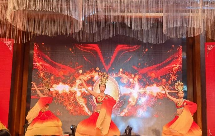 盛會(huì)現(xiàn)場(chǎng),開場(chǎng)舞《御龍?zhí)煜隆罚⒁庵鴩?guó)賓酒業(yè)龍騰天下。