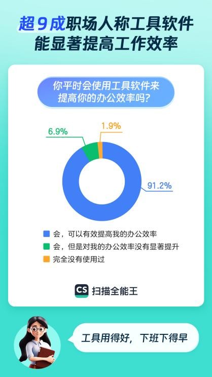 近期,合合信息旗下掃描全能王發(fā)布了《當(dāng)代職場人辦公習(xí)慣洞察報告》(以下簡稱“《報告》”),對五百余位職場人士進行了辦公工具軟件使用習(xí)慣調(diào)研。《報告》顯示,超9成的職場人會使用工具類軟件,并表示其能顯著提高工作效率。