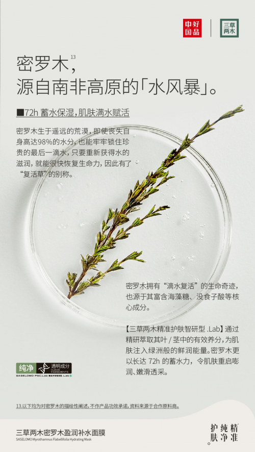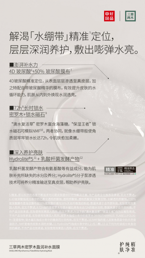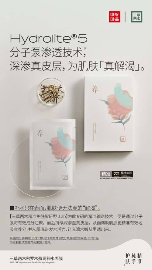 4D玻尿酸精準定 位,搭配自帶玻尿酸精華的膜布可以有效提升皮膚的水循環(huán)能力;滴水復活草”密羅木和“保濕王者”鎖水磁石二者協(xié)同,可實現(xiàn)長達72小時的鎖水,讓肌膚更加柔嫩;乳酸桿菌發(fā)酵產物和Hydrolite? 5分子泵滲透技術搭配使用可以讓肌膚補充到所缺失的水分及養(yǎng)分,深入養(yǎng)護亮膚,多重功效協(xié)同作用,讓進階補水更進一步。