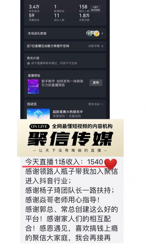 作為一家深知人才培育重要性的機(jī)構(gòu),聚信傳媒致力于幫助百萬(wàn)夢(mèng)想者實(shí)現(xiàn)他們的夢(mèng)想。通過(guò)精細(xì)化運(yùn)營(yíng)、團(tuán)隊(duì)學(xué)習(xí)和導(dǎo)師一對(duì)一指導(dǎo),聚信傳媒為每一位主播打造了一條清晰的職業(yè)發(fā)展路徑。無(wú)論你是希望成為全職主播,還是將直播作為副業(yè),聚信傳媒都能為你提供專(zhuān)業(yè)的支持和完善的培訓(xùn)體系。
