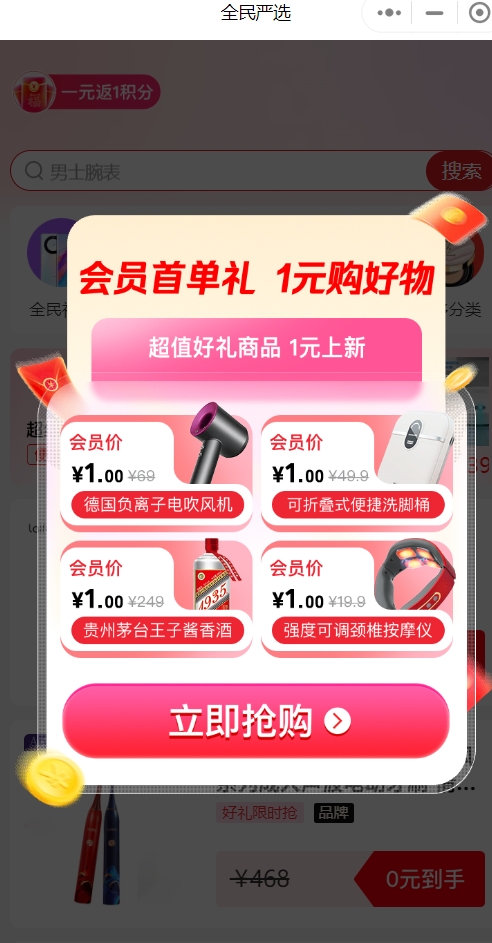 自元旦起,全民嚴(yán)選特推出“好禮一元購(gòu)“活動(dòng),加入會(huì)員即可享受會(huì)員首單禮1元購(gòu)好物福利!
