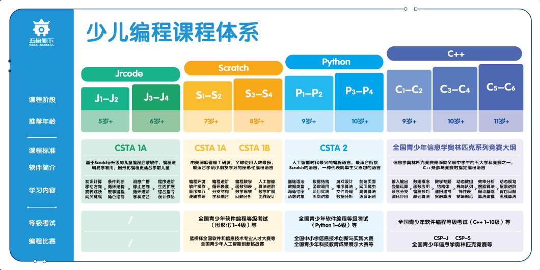 五格殿下擁有一批專業(yè)的教研團隊,精心打造具有趣味性、科學性、漸進性的編程課程體系,目前開設的編程課程有Jrcode、Scratch、Python、C++四門,可以覆蓋6 - 16歲各年齡段的學習需求!
