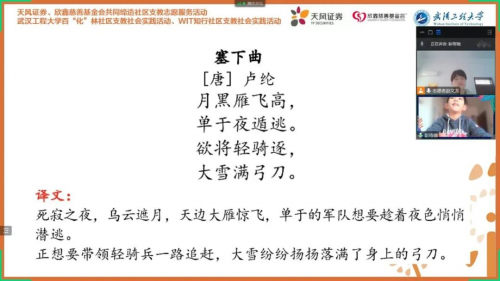 在共青團武昌區(qū)委的組織下,天風證券的志愿服務團隊和武漢市某街道一對一,開啟了走進社區(qū)進行支教的志愿者活動。在開展志愿者活動之前,天風證券先派人了解了該社區(qū)群眾的需求。當時正值寒假期間,該校區(qū)的群眾對于寒假期間能夠給在家的小孩子進行課業(yè)輔導有著比較大的需求。了解到社區(qū)居民們的這一需求以后,天風證券的黨員青年志愿服務隊就聯(lián)合武漢工程大學志愿服務隊的青年志愿者們,開展了一個為期兩個月的線上課程與輔導活動。這樣一個為期兩個月的公益活動,不僅解決了該社區(qū)居民們所遇到的實實在在的問題,還提升了社區(qū)居民的幸福感,在寒冷的冬天為社區(qū)居民創(chuàng)建了一個美好的生活。