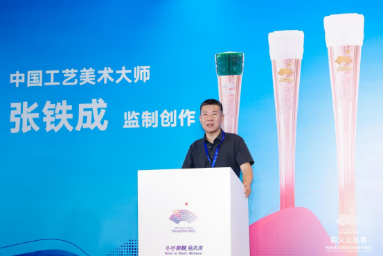 隨后,由中國玉雕第 一人,中國工藝美術(shù)大師張鐵成詳細介紹了《薪火火炬尊》的創(chuàng)作過程,解讀了中國玉石文化背后的內(nèi)涵。會上他還講到,《薪火火炬尊》是繼2008年奧運徽寶、2022年冬奧徽寶后的我國又一國際體育盛會紀念作品,一脈相承,是他的圓滿之作,具有很高的珍藏價值。