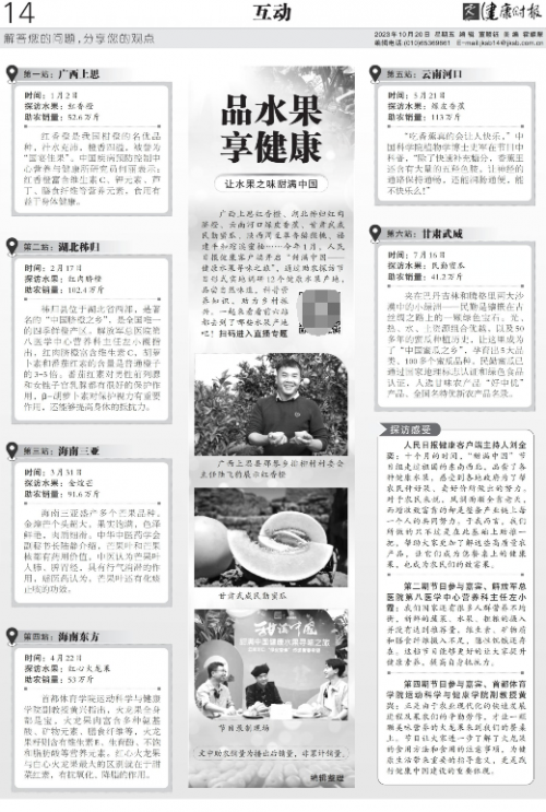 10月20日,《健康時(shí)報(bào)》發(fā)布互動(dòng)專欄《品水果 享健康》,對(duì)“甜滿中國(guó)”欄目的前六站進(jìn)行了回顧交流?!督】禃r(shí)報(bào)》由人民日?qǐng)?bào)社主辦,以做“中國(guó)人的健康顧問(wèn)”為宗旨,是國(guó)家新聞出版廣電總局評(píng)定的“中國(guó)百?gòu)?qiáng)報(bào)刊”,是我國(guó)健康生活服務(wù)類報(bào)紙中受眾量大、影響力強(qiáng)的報(bào)紙之一。
