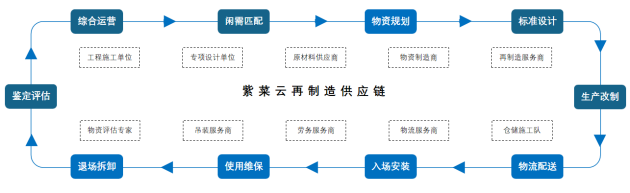基建產(chǎn)業(yè)具有參與主體多、交易鏈條長、物資類型復(fù)雜等特性,局部上云無法形成良性生態(tài)。為此,紫菜云平臺(tái)創(chuàng)新性的采用了鏈?zhǔn)浇Y(jié)構(gòu),直接推動(dòng)整體產(chǎn)業(yè)鏈數(shù)字化改造,整合鑒定評(píng)估、標(biāo)準(zhǔn)化設(shè)計(jì)、再制造工藝、倉儲(chǔ)、物流、吊裝、勞務(wù)等基建產(chǎn)業(yè)服務(wù)商,打造再制造供應(yīng)鏈體系。從工程物資規(guī)劃、物資專項(xiàng)設(shè)計(jì)、生產(chǎn)改制、物流配送、入場安裝、使用維保、退場拆卸,到閑置盤活,紫菜云整合規(guī)劃、設(shè)計(jì)、制造、物流、倉儲(chǔ)、勞務(wù)、吊裝等服務(wù)商,提供一體化打包服務(wù),讓物資更省錢,讓工程更省心。