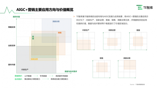 報告顯示:AIGC+營銷目前主要應(yīng)用于內(nèi)容生產(chǎn)、創(chuàng)新運營、客服、銷售、洞察決策五類方向。其中,洞察決策提供的價值高,所需要的數(shù)據(jù)與技術(shù)要求也高。
