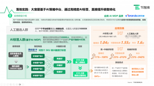 大寵愛是國內(nèi)知名的驅(qū)蟲藥品牌,618期間需要提高投放人群購買轉(zhuǎn)化。云積天赫基于自研產(chǎn)品“AI策略中臺”(AI MDP),全選出高質(zhì)量的AI標(biāo)簽人群,對應(yīng)到高轉(zhuǎn)化產(chǎn)品。實踐證明,AI標(biāo)簽人群對比人工圈選人群在客單價、付款轉(zhuǎn)化率和ROI上均有顯著提升。