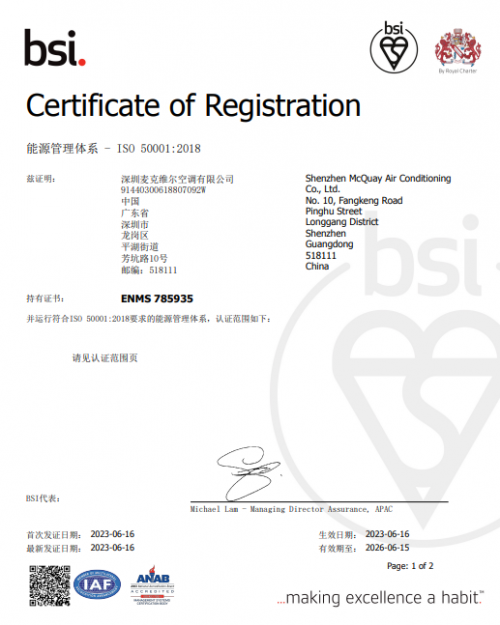 近期,麥克維爾深圳工廠獲得《能源管理體系ISO 50001:2018證書》,標志著麥克維爾能源管理體系建設取得關鍵性成果!