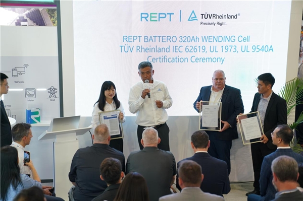 瑞浦蘭鈞問頂320Ah儲(chǔ)能電芯已通過了德國(guó)萊茵TüV Rheinland頒發(fā)的UL 1973、UL 9540A、IEC 62619三項(xiàng)國(guó)際權(quán)威認(rèn)證,RE+2023上,瑞浦蘭鈞副總裁侯敏、萊茵北美區(qū)電力電子部門經(jīng)理Howard Liu出席了頒證儀式。瑞浦蘭鈞問頂320Ah電池獲三重國(guó)際認(rèn)證也標(biāo)志著該電池具備了進(jìn)入歐洲、北美等國(guó)際市場(chǎng)的通行證,并將迎來更廣闊的市場(chǎng)機(jī)遇。