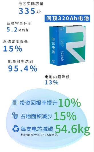 問頂320Ah電池以其超行業(yè)標(biāo)準(zhǔn)的強(qiáng)性能備受矚目,規(guī)?;瘧?yīng)用問頂320Ah電芯能能夠減少15%的用地面積,增加10%以上的凈利潤(rùn),且相較同尺寸的280Ah電芯,每支320Ah電芯減碳54.6kg,減碳減排,助力碳中和目標(biāo)。