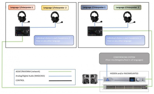 所有Anubis均通過網(wǎng)絡(luò)互聯(lián)互通(AES67/ST2110),因此每個(gè)音頻流在任一Anubis上均可用。Hapi Mk II(AD/DA、Madi、AES/EBU轉(zhuǎn)換器)擁有所有標(biāo)準(zhǔn)格式,作為輸入/輸出點(diǎn)連接到現(xiàn)有的控制臺(tái)、PA或會(huì)議系統(tǒng)。這種口譯解決方案的一個(gè)主要優(yōu)點(diǎn)是,它能通過VPN和每個(gè)Anubis的IP地址進(jìn)行遠(yuǎn)程控制。