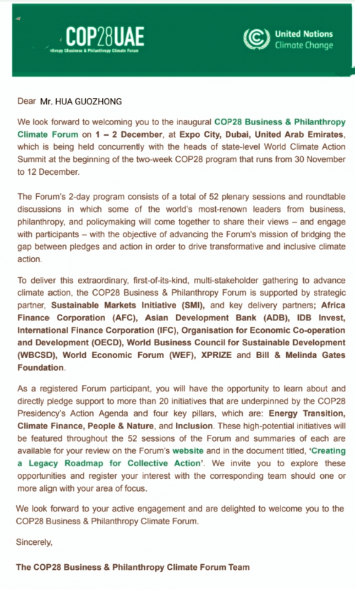 據(jù)相關(guān)媒體綜合報(bào)道: 2023年11月30日至12月12日,第28屆聯(lián)合國(guó)氣候變化大會(huì)在迪拜世博城舉行。人類(lèi)健康組織大中華區(qū)主 席華國(guó)中將應(yīng)主辦方邀請(qǐng)前往聯(lián)合國(guó)氣候變化大會(huì)舉辦地迪拜“世博城”參加盛會(huì)。