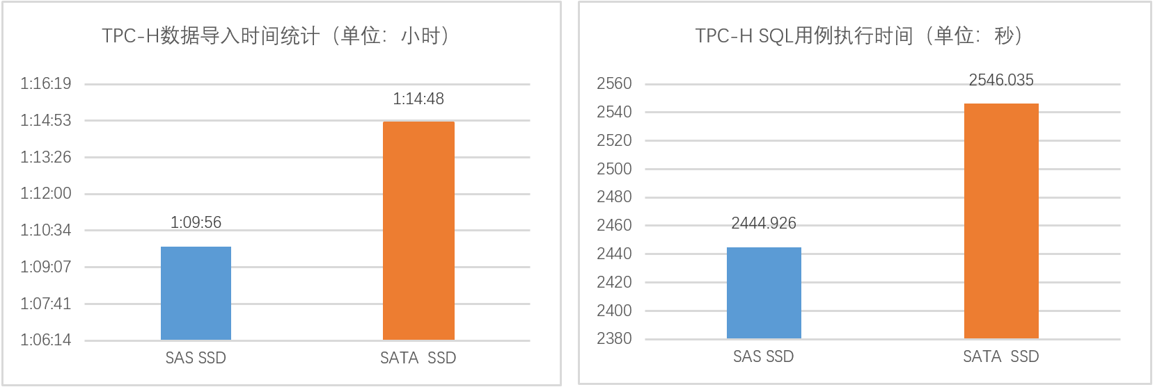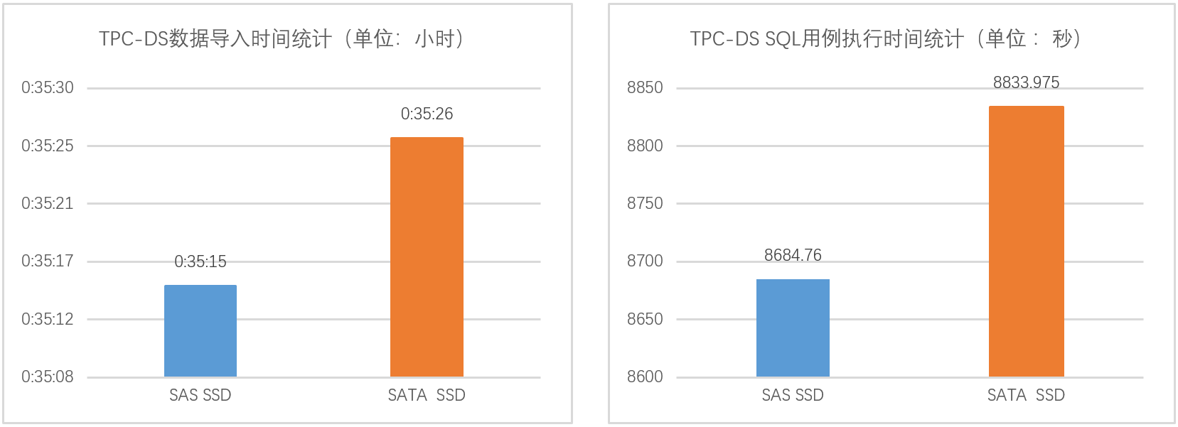 TPC-DS測試是通過FTP協(xié)議加載數(shù)據(jù)到GBase數(shù)據(jù)庫表。從圖5可見,在相同物理硬件環(huán)境下,SAS SSD不管是在數(shù)據(jù)導(dǎo)入還是在SQL用例執(zhí)行時(shí)間上所用時(shí)間都略低于SATA SSD,具備一定時(shí)間優(yōu)勢,通過降低系統(tǒng)延遲,提供更快的數(shù)據(jù)訪問速度來提升用戶體驗(yàn)。