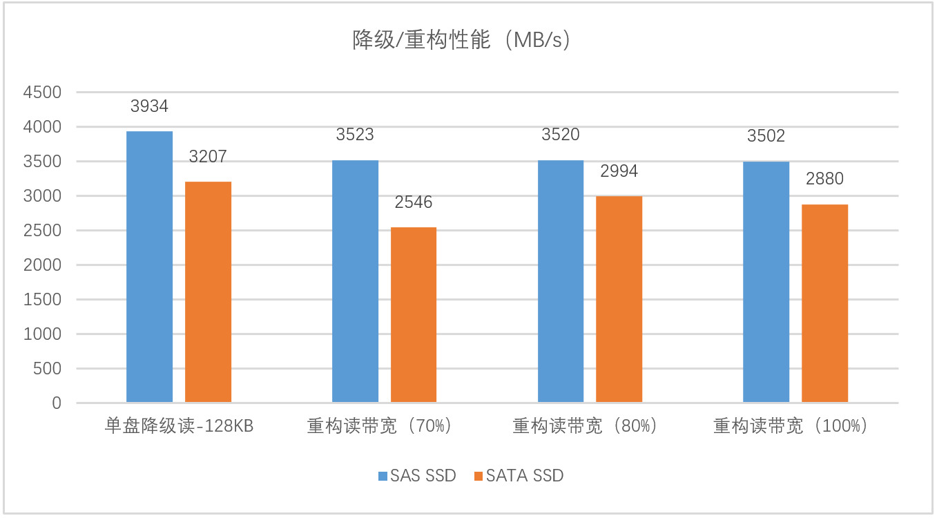 如圖4所示,不管是在單盤降級讀性能還是在重構(gòu)讀帶寬條件下,SAS盤的表現(xiàn)都優(yōu)于SATA,單盤降級讀性能優(yōu)于SATA 22.7% 左右,重構(gòu)讀帶寬性能上比SATA最大有38.4% 左右的提升,滿足在各種復(fù)雜場景下業(yè)務(wù)不中斷、數(shù)據(jù)不丟失的超高可用性要求。