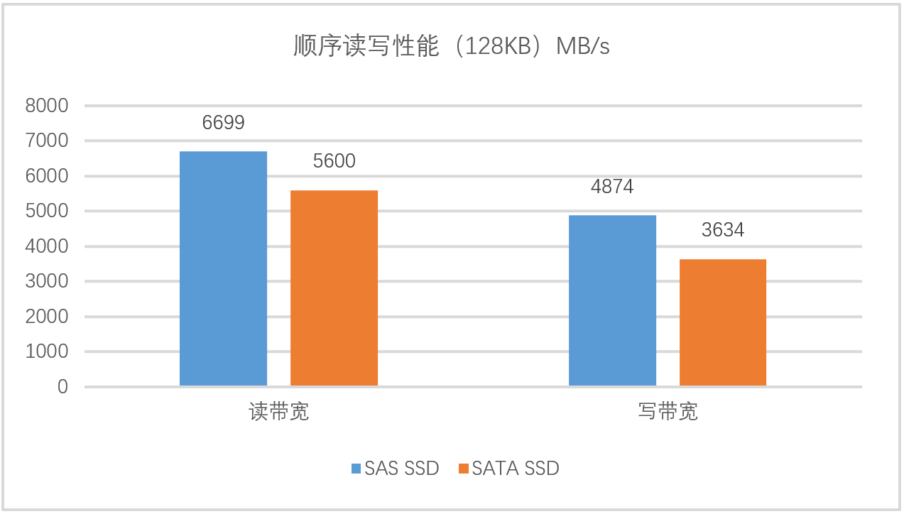 在本次測試中,將6個(gè)SAS SSD配置Raid5,12塊SATA配置Raid50,在Server主機(jī)使用FIO測試工具進(jìn)行128KB順序讀寫帶寬性能壓測。從圖3結(jié)果表現(xiàn)可知,SAS SSD讀寫帶寬更優(yōu),讀帶寬比SATA有19.6% 左右提升,寫帶寬提升34% 左右,展現(xiàn)了SAS SSD在Raid邏輯卷帶寬下的絕對優(yōu)勢,可為高并發(fā)的業(yè)務(wù)場景提供穩(wěn)定、順暢的數(shù)據(jù)服務(wù)體驗(yàn)。