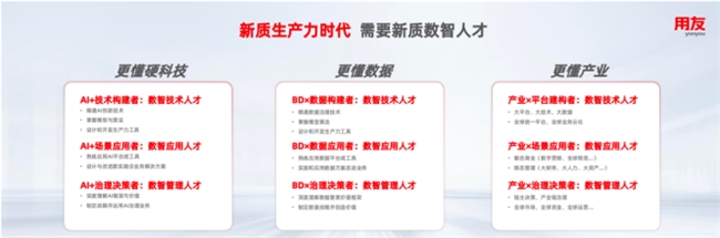 王文京提到,數(shù)字中國(guó)呼喚數(shù)字棟梁,數(shù)字經(jīng)濟(jì)時(shí)代,需要具有行業(yè)創(chuàng)新能力、場(chǎng)景應(yīng)用能力、DT認(rèn)知能力的數(shù)智化人才;新質(zhì)生產(chǎn)力時(shí)代,需要更懂硬科技、更懂?dāng)?shù)據(jù)、更懂產(chǎn)業(yè)的新質(zhì)數(shù)智人才。