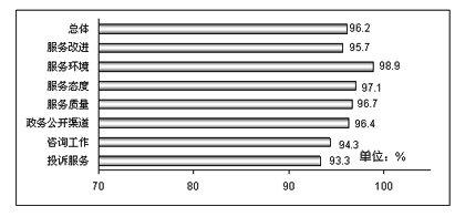 ?。?)在本次調(diào)查設(shè)置的“總體滿意度”、“服務(wù)質(zhì)量”、“服務(wù)態(tài)度”、“政務(wù)公開渠道”、“咨詢工作”、“投訴服務(wù)”、“服務(wù)環(huán)境”等多項指標(biāo)上,公眾滿意度都在九成三以上,呈現(xiàn)出比非政務(wù)中心窗口更高的水平,其中,總體滿意度高達96.2%(見下圖);在“服務(wù)改進情況”指標(biāo)上,53.7%的受訪者認(rèn)為政務(wù)中心窗口“有很大改進”,高出非政務(wù)中心窗口13.3個百分點。