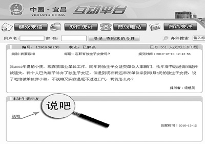 今年12月10日,一位名為“很想哭”的來件人發(fā)帖,標題是“在職有獨生子女費嗎?”留言稱:“我2002年得的小孩,現(xiàn)在某事業(yè)單位工作,同年將獨生子女證交單位人事部門,次年春節(jié)后經(jīng)詢問證件被遺失,我個人已為孩子補辦了獨生子女證,但是到現(xiàn)在我還未在單位拿到每月5元的獨生子女費,說了吧怕被單位穿小鞋,不說嘛又實在是慪不過這口氣,我能怎么辦?”