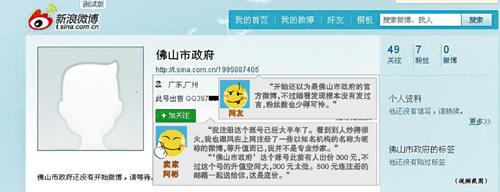 昨日,有網(wǎng)友向本報報料,在微博上發(fā)現(xiàn)了一個“佛山市政府”的賬號。記者搜索發(fā)現(xiàn),該賬號確實存在,截至昨日僅有7個粉絲。該賬號的說明上還明確說賬號可以出售,并留下了QQ號碼。
