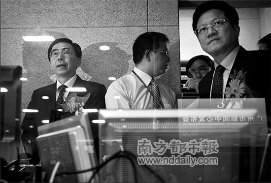 昨日,廣州市委書記朱小丹(左一)、市長張廣寧(右一)等領(lǐng)導(dǎo)參觀了廣州新聞中心的設(shè)備。本報記者譚偉山攝