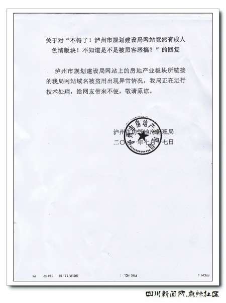 這名姓雷的工程師還介紹說,信息中心的工作人員每月都在對該網(wǎng)站進行抽檢,而出現(xiàn)此類問題實在在意料之外。他感謝網(wǎng)友的監(jiān)督,并表示,以后會加強這方面的巡查和監(jiān)督,盡量避免這樣的問題再次出現(xiàn)。而據(jù)了解,出現(xiàn)問題的‘房地產(chǎn)業(yè)’版塊負責(zé)單位瀘州市房地產(chǎn)管理局也在18日上午第一時間在瀘州論壇上進行了官方正式的回復(fù),并對網(wǎng)友表示了歉意。