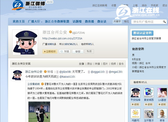打開浙江微博,“浙江臺州公安”格外醒目,開通一年時間,聽眾粉絲已經(jīng)突破100萬。