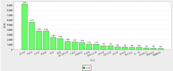 監(jiān)測顯示,在17天時間里,新華網(wǎng)正面新聞發(fā)文量最高,達(dá)到9294篇;中新網(wǎng)、人民網(wǎng)新聞發(fā)布數(shù)量依次為5772篇、3796篇分別排在發(fā)文榜的二、三位。