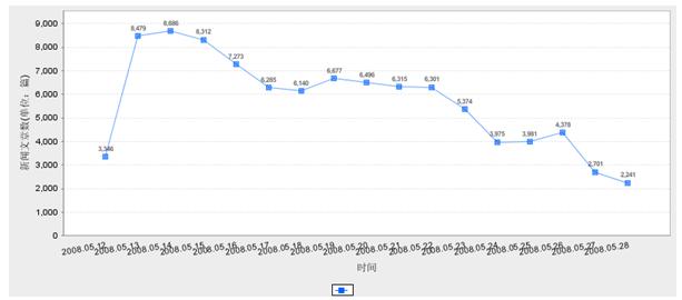 上圖所示,5月12日地震當(dāng)天,互聯(lián)網(wǎng)上的新聞數(shù)量就達(dá)到3346篇;14日,在搶險救災(zāi)取得突破性進(jìn)展后,文章數(shù)達(dá)到監(jiān)測期間的最高點(diǎn)8696篇;隨后4天文章數(shù)量緩慢下滑;19日,文章數(shù)略有上升后下降,并在26日掀起一個小高峰后回落到2241篇。