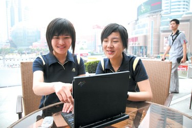 圖為游客在徐家匯港匯廣場利用筆記本無線上網查附近商家信息。