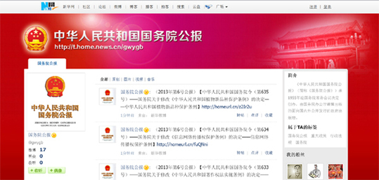 中華人民共和國(guó)國(guó)務(wù)院公報(bào)官方微博2月28日在新華網(wǎng)新華微博開通。國(guó)務(wù)院的重要政策法規(guī)文件等內(nèi)容將通過微博客這一新媒體形式集中、準(zhǔn)確、及時(shí)地向社會(huì)公眾公開。