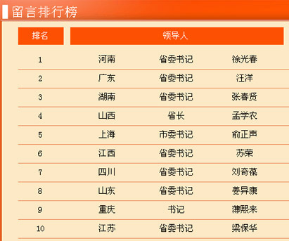 自2007年人民網(wǎng)推出“中國地方領(lǐng)導(dǎo)人報(bào)道集”以來,網(wǎng)友給各地領(lǐng)導(dǎo)發(fā)表了眾多留言,留言涉及網(wǎng)友對當(dāng)?shù)仡I(lǐng)導(dǎo)和當(dāng)?shù)厣鐣?jīng)濟(jì)發(fā)展的評論、意見、建議等各方面,此次將網(wǎng)友留言欄目進(jìn)行排名,提供了一個進(jìn)行分析比對的平臺。