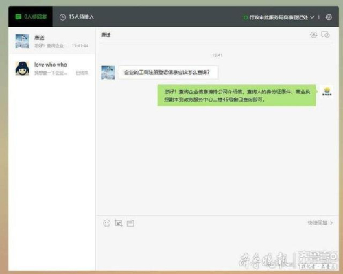近日,記者在煙臺開發(fā)區(qū)政務(wù)服務(wù)中心看到,行政審批服務(wù)局商事登記處窗口工作人員劉少霞正在通過窗口“云客服”系統(tǒng),為辦事群眾解答企業(yè)設(shè)立登記方面的業(yè)務(wù)咨詢。兩人一問一答,實時溝通交流,利用方寸鍵盤就為群眾辦事消除了疑惑,解決了問題。