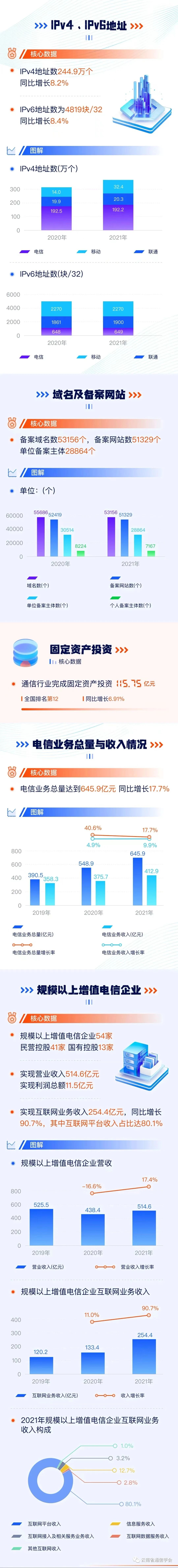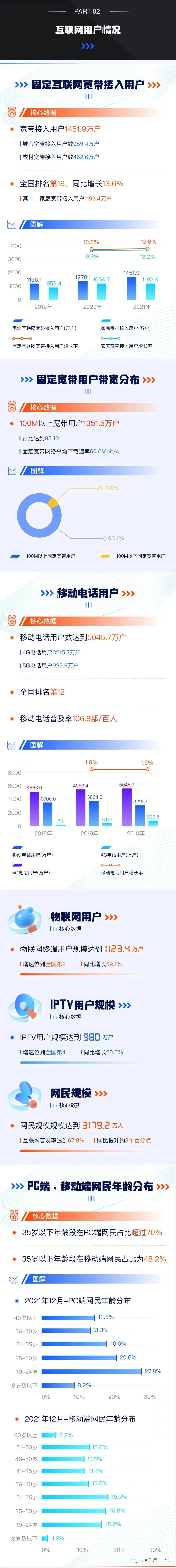 《報(bào)告》顯示,2021年我省互聯(lián)網(wǎng)行業(yè)發(fā)展勢頭強(qiáng)勁,行政村100%通光纖寬帶網(wǎng)絡(luò),移動通信基站數(shù)量達(dá)35.9萬個(gè),5G基站實(shí)現(xiàn)翻倍增長,100M及以上寬帶用戶占比93.1%,移動電話普及率達(dá)106.9部/百人,物聯(lián)網(wǎng)終端用戶同比增長59.1%,網(wǎng)民規(guī)模達(dá)3179.2萬人,互聯(lián)網(wǎng)普及率達(dá)67.8%,移動互聯(lián)網(wǎng)用戶接入流量在全國排名第9位。數(shù)字經(jīng)濟(jì)規(guī)模達(dá)6700億元,數(shù)字經(jīng)濟(jì)核心產(chǎn)業(yè)實(shí)現(xiàn)營業(yè)收入1939.68億元,政務(wù)服務(wù)事項(xiàng)網(wǎng)上可辦率達(dá)95%,28個(gè)“5G+智慧醫(yī)療”項(xiàng)目入選工信部、國家衛(wèi)健委試點(diǎn)示范目錄,網(wǎng)絡(luò)交易額3495.8億元,網(wǎng)絡(luò)零售額1323億元,農(nóng)產(chǎn)品網(wǎng)絡(luò)零售額358.2億元,省級工業(yè)互聯(lián)網(wǎng)安全態(tài)勢感知平臺監(jiān)測能力覆蓋全省16個(gè)州(市)2970家聯(lián)網(wǎng)工業(yè)企業(yè)。