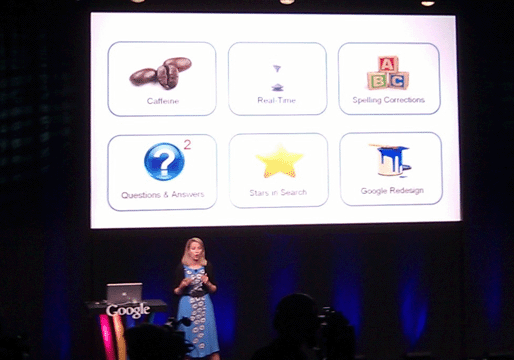 9:40:谷歌副總裁瑪麗莎?梅耶爾(Marissa Mayer)登臺,她首先做了一些簡要的描述:每周有10億用戶通過Google搜索。接著她討論了Google搜索的一些新功能。如Google Caffeine,實(shí)時(shí)搜索,時(shí)間軸瀏覽,問答功能增強(qiáng)等。