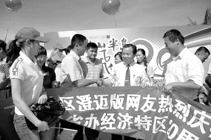 2008年4月7日,在一次直播活動上,時任澄邁縣委副書記、縣長楊思濤(中)與天涯社區(qū)海南澄邁版首席版主張運勝握手。之后,澄邁版網友將橫幅贈送給澄邁縣委縣政府。