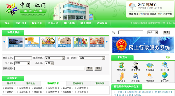 江門市開展行政中心網(wǎng)上行政服務(wù)(審批)建設(shè)工作在國內(nèi)起步較早,2002年建成江門市政府網(wǎng)上行政服務(wù)系統(tǒng),在國內(nèi)率先實現(xiàn)政府20多個職能部門聯(lián)合在網(wǎng)上開展行政服務(wù)。2009年,江門市開發(fā)了集OA辦公自動化系統(tǒng)、網(wǎng)上行政服務(wù)系統(tǒng)和行政中心門戶網(wǎng)站后臺維護系統(tǒng)于一體、具有國內(nèi)先進性的江門市人民政府行政服務(wù)中心綜合信息系統(tǒng),實現(xiàn)了用戶只需在一個入口登錄,即可同時操作該系統(tǒng)的幾個功能模塊,實現(xiàn)了業(yè)務(wù)數(shù)據(jù)的交互和共享;該系統(tǒng)規(guī)范集成了87個部門超過618項的審批事項流程,網(wǎng)上行政服務(wù)系統(tǒng)后臺程序內(nèi)置各類行政審批流程約618項(條),并集成了與之相應(yīng)的各類申報材料、表格789種(個),實現(xiàn)了在行政中心辦理的審批事項網(wǎng)上全程審批率達到100%,成為了“一站式”和“一體化”的處理平臺,極大提高企業(yè)和市民的辦事效率,并榮獲第六屆(2011)中國特色政府網(wǎng)站評選“特色提名獎”。