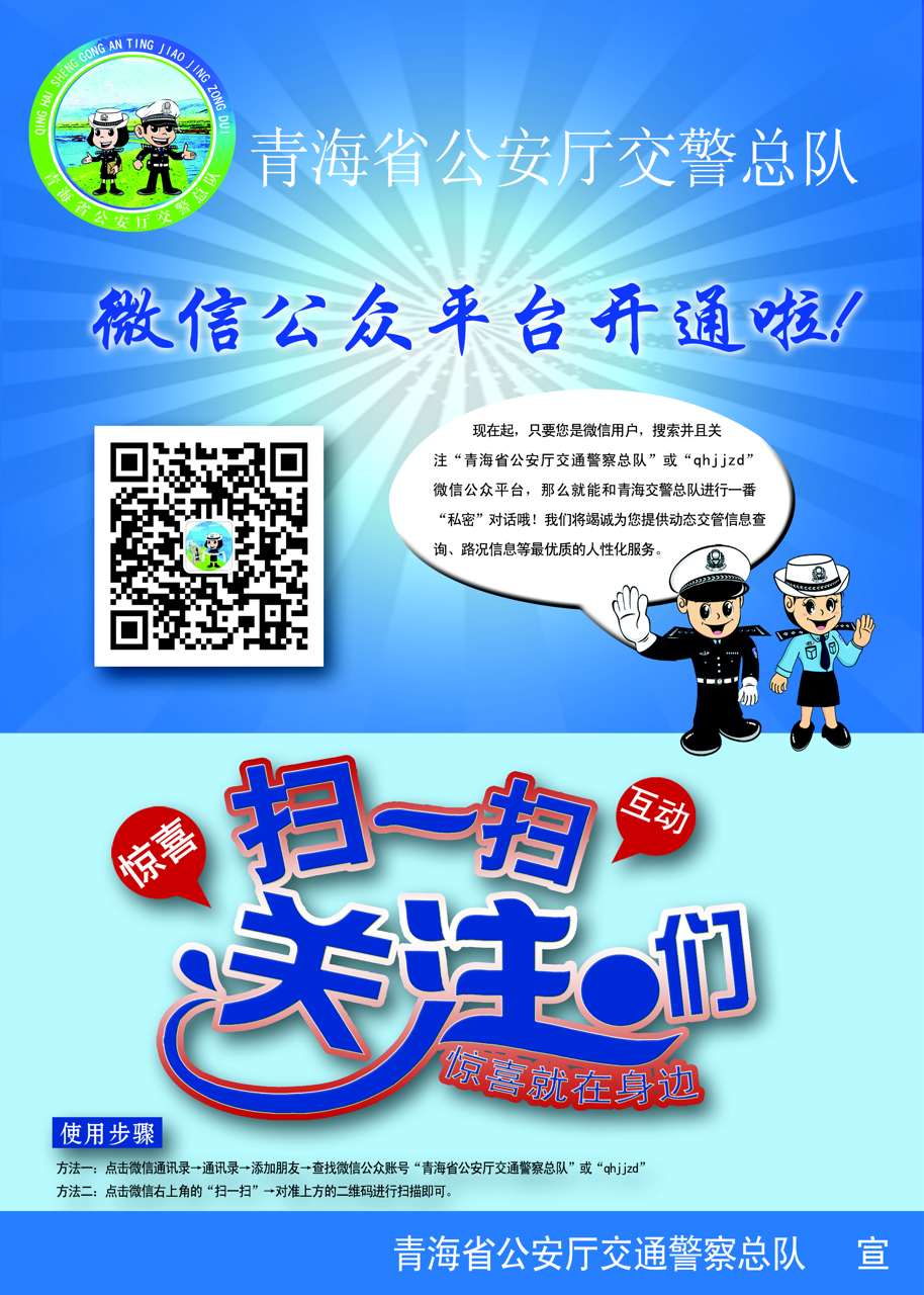 點(diǎn)擊微信-添加朋友-查找微信公眾賬號-“青海省公安廳交通警察總隊”或“qhjjzd”