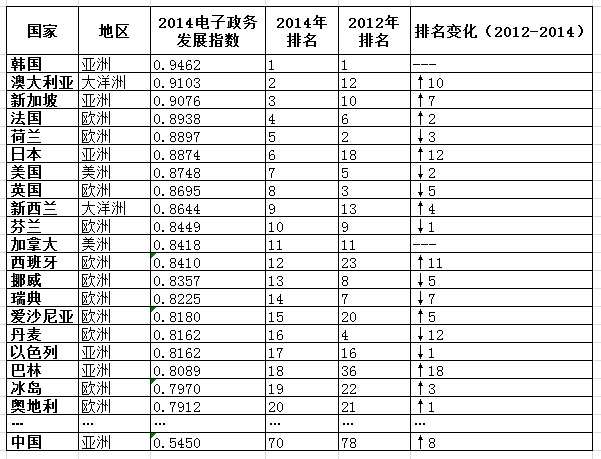 報(bào)告顯示,韓國以0.9462的總分高居全球電子政務(wù)發(fā)展排行榜的首位,名列第二至十位的是澳大利亞、新加坡、法國、荷蘭、日本、美國、英國、新西蘭、芬蘭。中國以0.5450的總分排名70位,比2012年上升了8位。