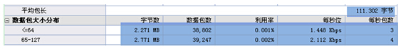 上圖也反映了一些特征,我們看到,抓包網(wǎng)絡(luò)內(nèi)的數(shù)據(jù)包長(zhǎng)只有111.3Byte,這個(gè)平均包長(zhǎng)是偏小的,而且數(shù)據(jù)包大小分析發(fā)現(xiàn)<=64字節(jié)和65-127字節(jié)之間的數(shù)據(jù)占了絕大多少,這就充分說(shuō)明了網(wǎng)絡(luò)中有大量的小包存在。